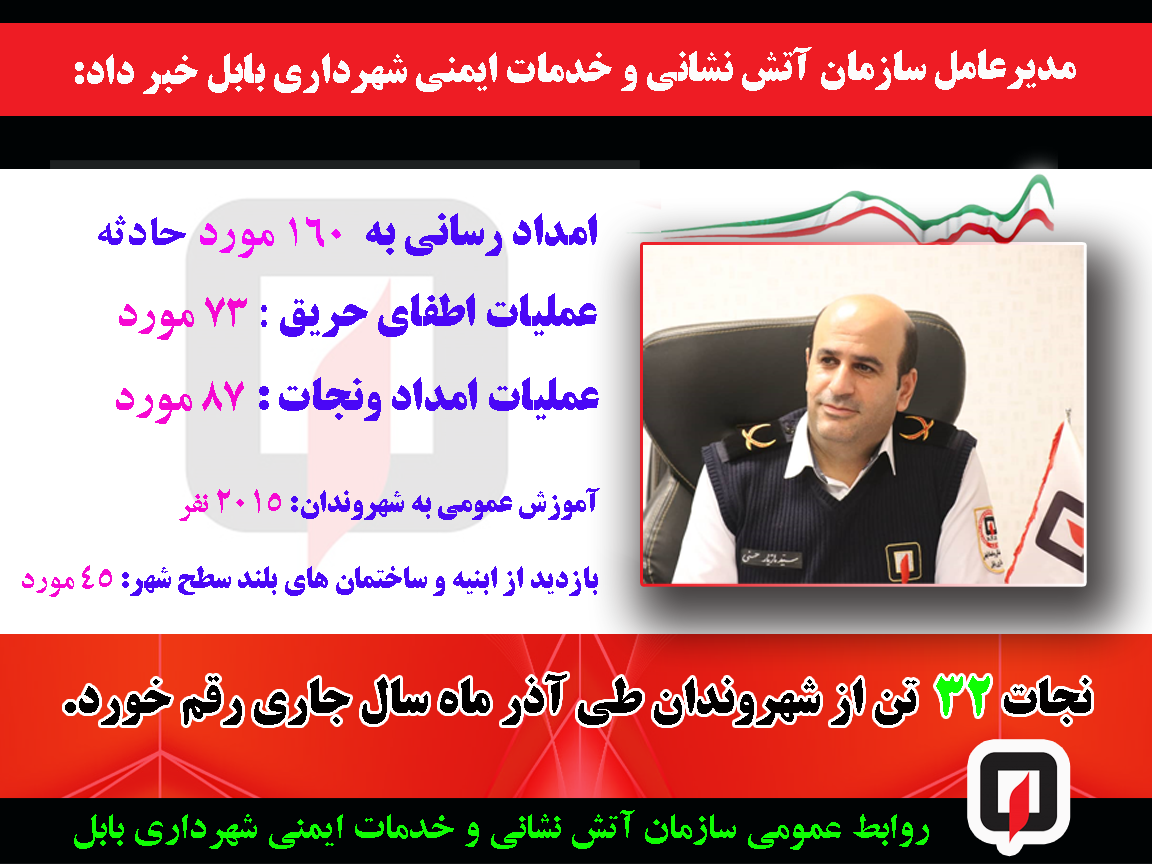 ۱۶۰ مورد حادثه در آذر ماه سال جاری توسط آتش نشانی بابل ثبت شد که به تفکیک ۷۳ مورد آتش سوزی و خدمات ایمنی و ۸۷ مورد عملیات نجات بوده است که منجر به نجات ۳۲ تن از شهروندان گردیده است.