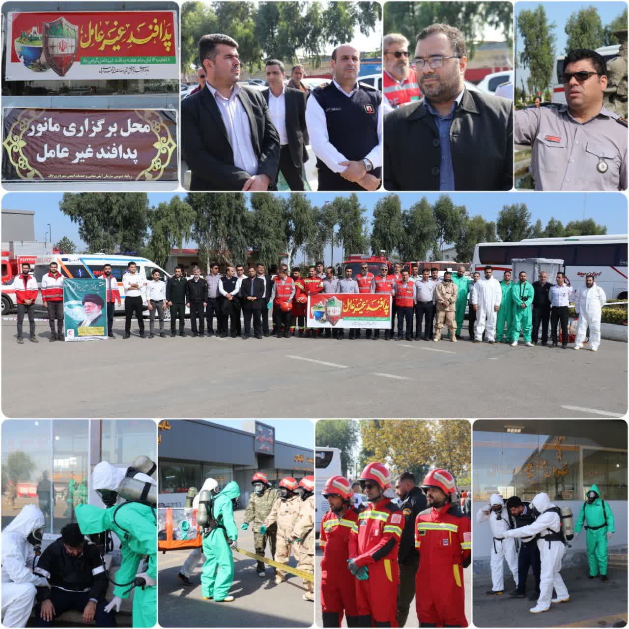 مانور « کنترل نشت مواد شیمیایی » به مناسبت #هفتهپدافندغیرعامل با حضور علی قائمی معاون شهرسازی و دبیر ستاد پدافند غیرعامل شهرداری و سیدمازیارحسنی مدیرعامل سازمان آتش نشانی و با مشارکت عوامل انتظامی،هلال احمر،اورژانس و پلیس راهور در محوطه ترمینال غرب برگزار گردید.