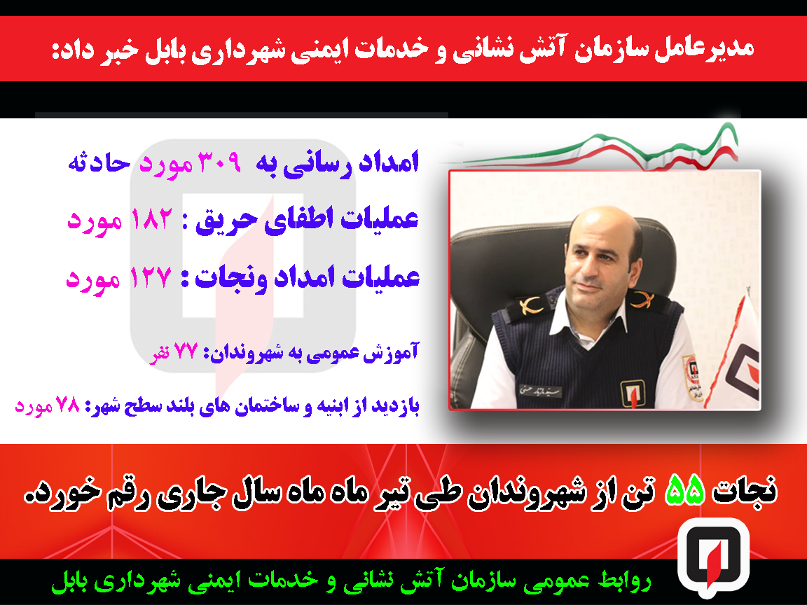 ۳۰۹ مورد حادثه در تیر ماه سال جاری توسط آتش نشانی بابل ثبت شد که به تفکیک ۱۸۲ مورد آتش سوزی و خدمات ایمنی و ۱۲۷ مورد عملیات نجات بوده است که منجر به نجات ۵۵ تن از شهروندان گردیده است.