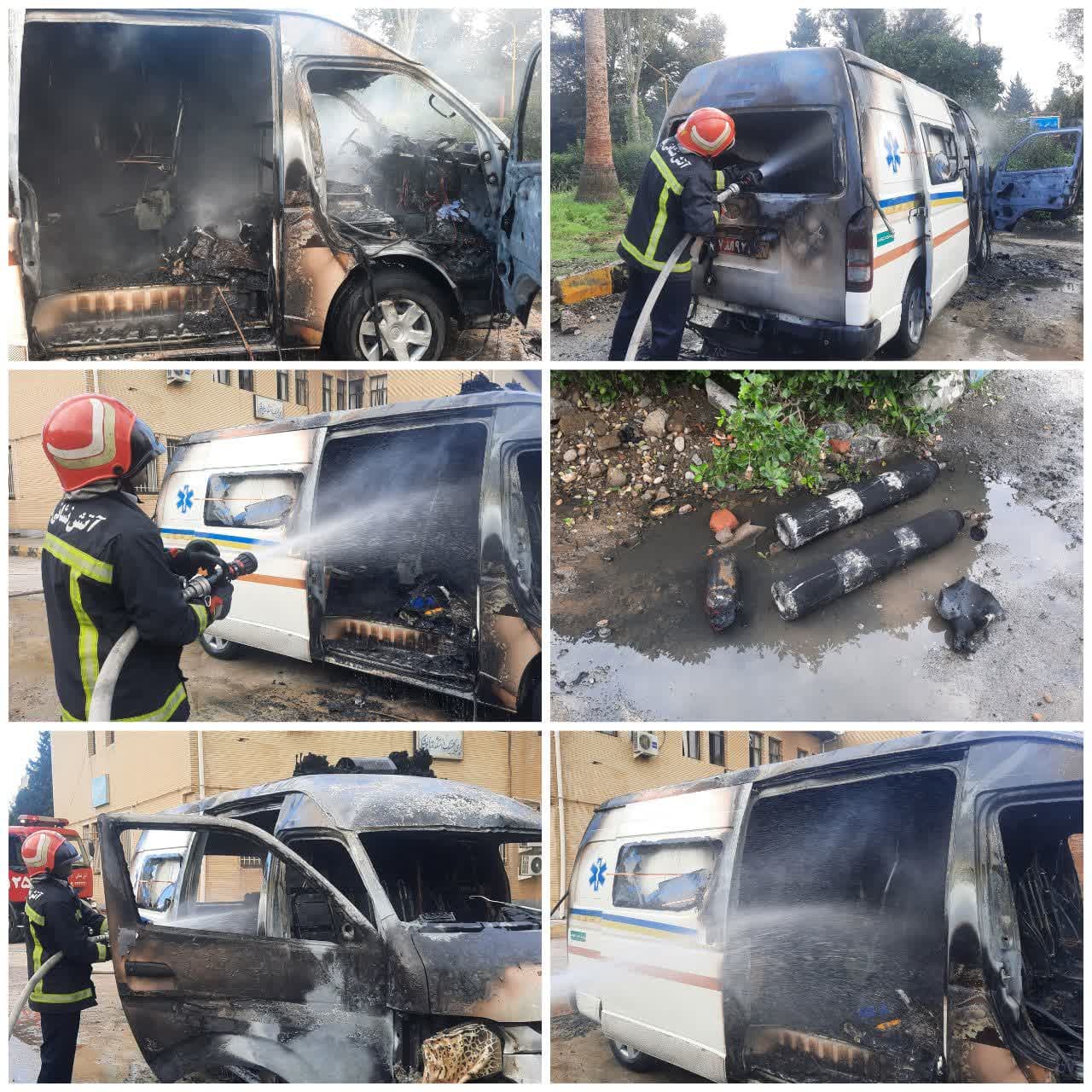 پس از رسیدن آتش نشانان به محل حادثه و بررسی اولیه مشخص گردید یک دستگاه آمبولانس از قسمت کابین داخلی خودرو دچار آتش سوزی شده است و شعله های آن به سرعت در حال گسترش و سرایت به بدنه و موتور خودرو بوده بطوریکه شعله و شدت حرارت ناشی از این حریق منجر به انفجار کپسول های اکسیژن موجود در داخل کابین خودرو شده است.