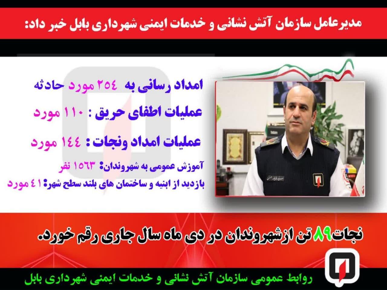 ۲۵۴ مورد حادثه در دی ماه سال جاری توسط آتش نشانی بابل ثبت شد که به تفکیک ۱۱۰ مورد #آتش_سوزی و خدمات ایمنی و ۱۴۴ مورد عملیات #نجات بوده است که منجر به نجات ۸۹ تن از شهروندان گردیده است.