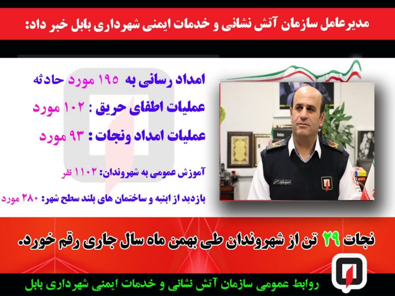 مدیر عامل سازمان آتش نشانی و خدمات ایمنی شهرداری بابل از وقوع ۱۹۵ مورد حادثه و نجات ۲۹ تن از شهروندان در بهمن ماه سال جاری خبر داد.