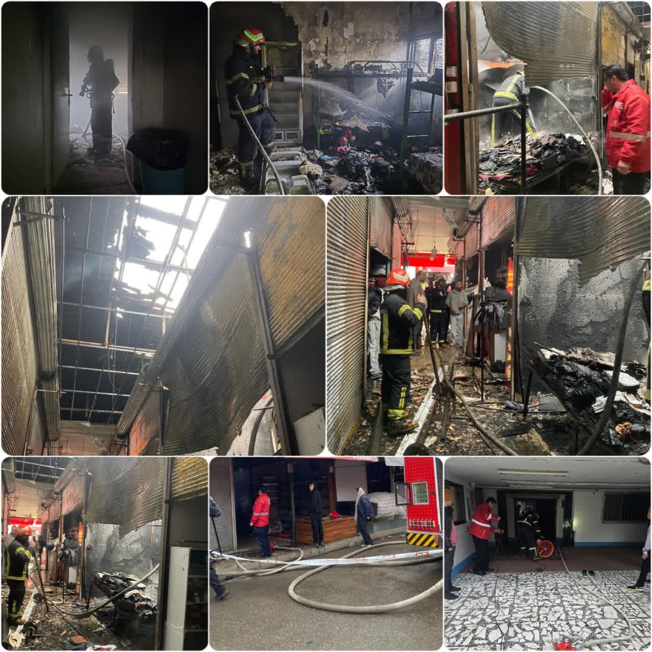 پس از حضور آتش نشانان در محل حادثه و ارزیابی اولیه مشخص گردید شعله های آتش سوزی شدید و گسترده چند دهنه مغازه لباس فروشی چسبیده در حال زبانه کشیدن است بطوریکه به سقف بازار نیز سرایت کرده و به سرعت در حال گسترش و سرایت به اطراف است. ماموران آتشنشانی در کمترین زمان ممکن با تجهیز خود به دستگاه تنفسی، با استفاده از تجهیزات خاموشکننده نسبت به مهار شعلههای آتش و ایمن سازی محل حادثه اقدام کردند و مانع از گسترش شدید آتش و سرایت به اطراف بروز خسارات بسیار گسترده به بازار و مغازه های مملو از اجناس و چسبیده به هم در بازار شدند و پس از مهار کامل حریق به عملیات خود خاتمه دادند.