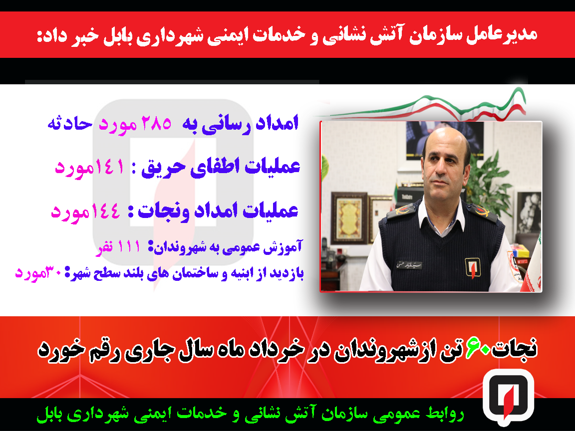 ۲۸۵ مورد حادثه در خرداد ماه سال جاری توسط آتش نشانی بابل ثبت شد که به تفکیک ۱۴۱ مورد آتش سوزی و خدمات ایمنی و ۱۴۴ مورد عملیات نجات بوده است که منجر به نجات ۶۰ تن از شهروندان گردیده است.